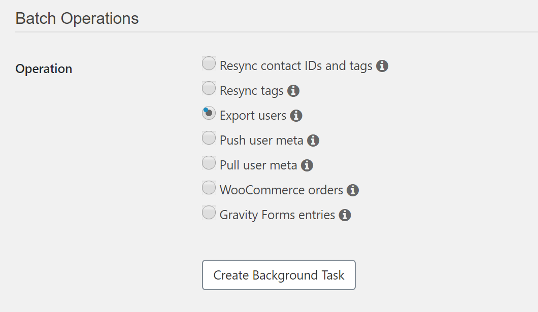 To do this, go to Settings → WP Fusion → Advanced → Batch Operations in your WordPress dashboard. Here, you can select the operation you want to perform. For example, Export Users to add all existing WordPress users to Sender or Push User Meta to update existing contact information.